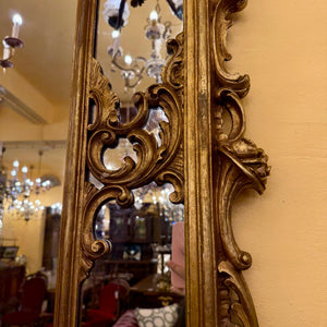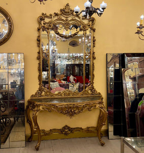 An exceptional Rococo-style mirror and console table set, late 19th to early 20th century. The carved wood frame is alive with scrolling acanthus leaves, floral details, and sweeping curves, all finished in a rich gilding that brings warmth and depth to the piece. The console is topped with a beautifully shaped marble slab, its dark veining adding a subtle contrast to the gold tones below.