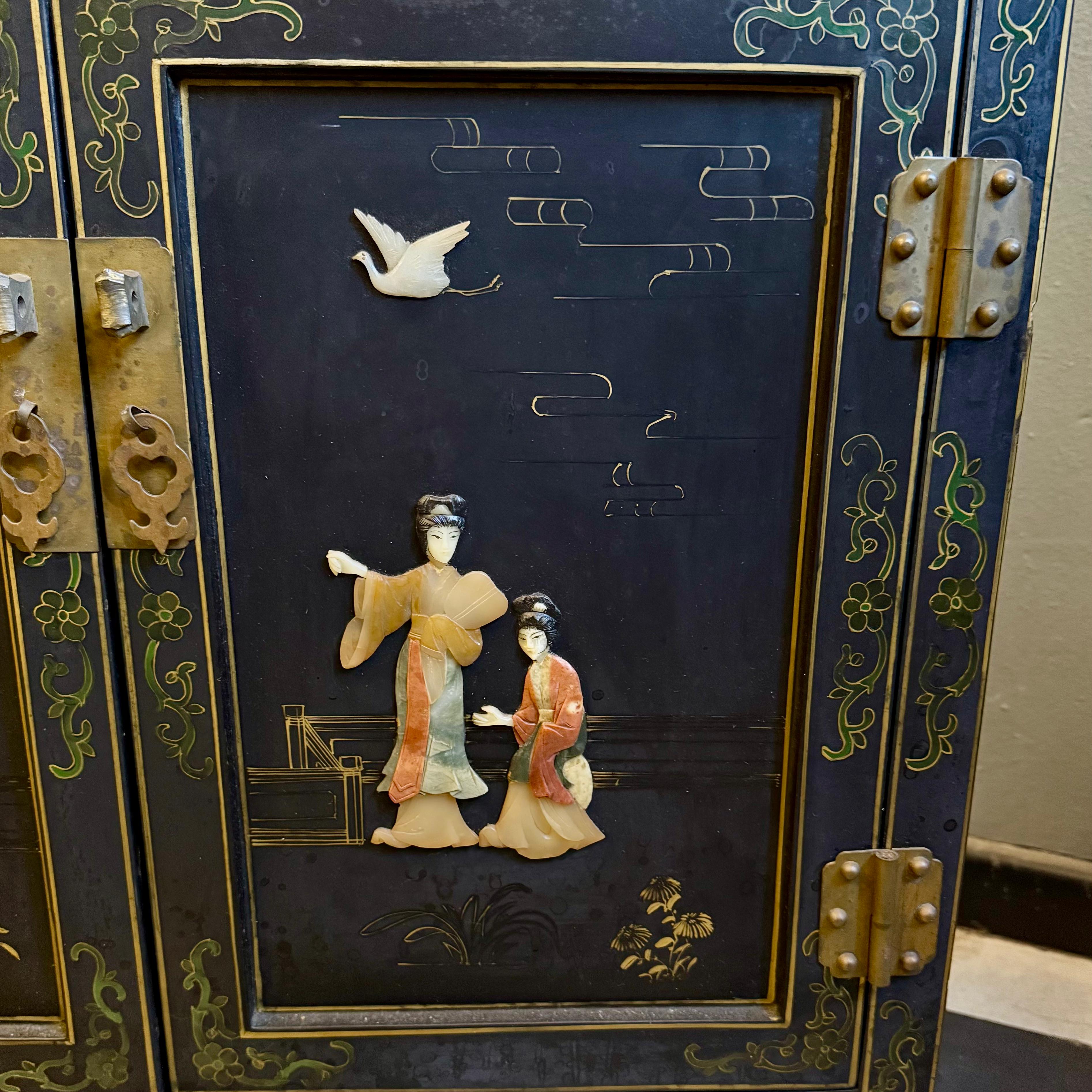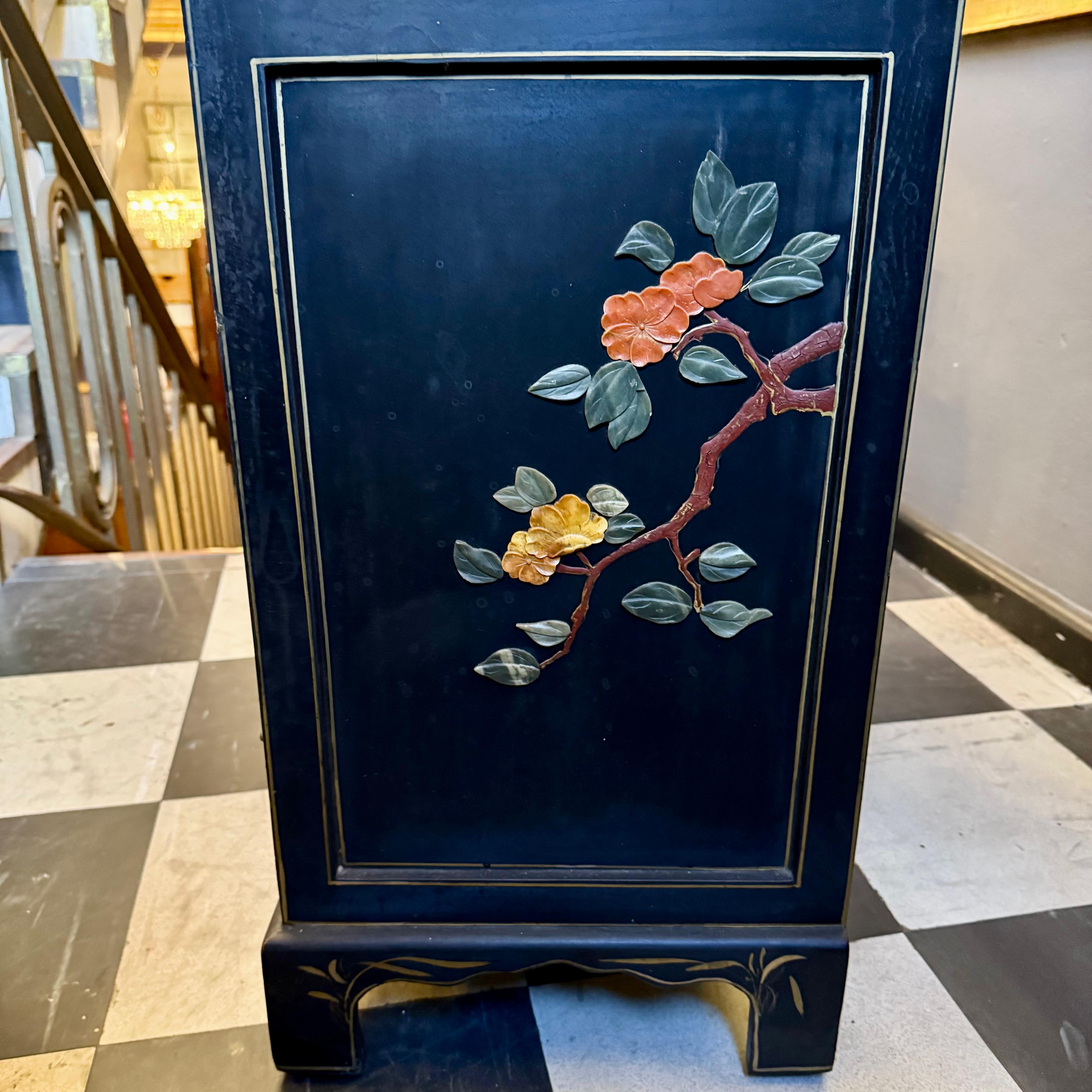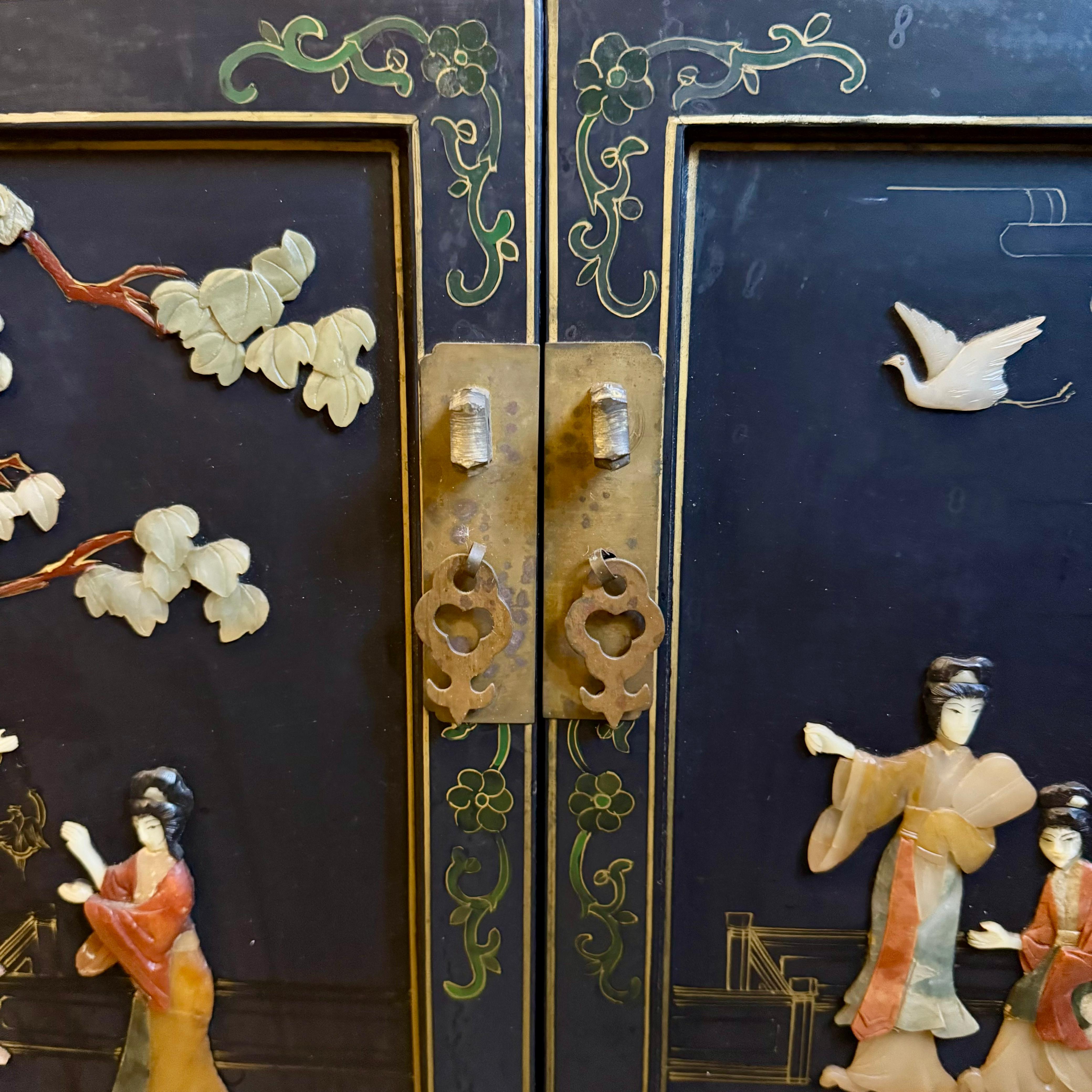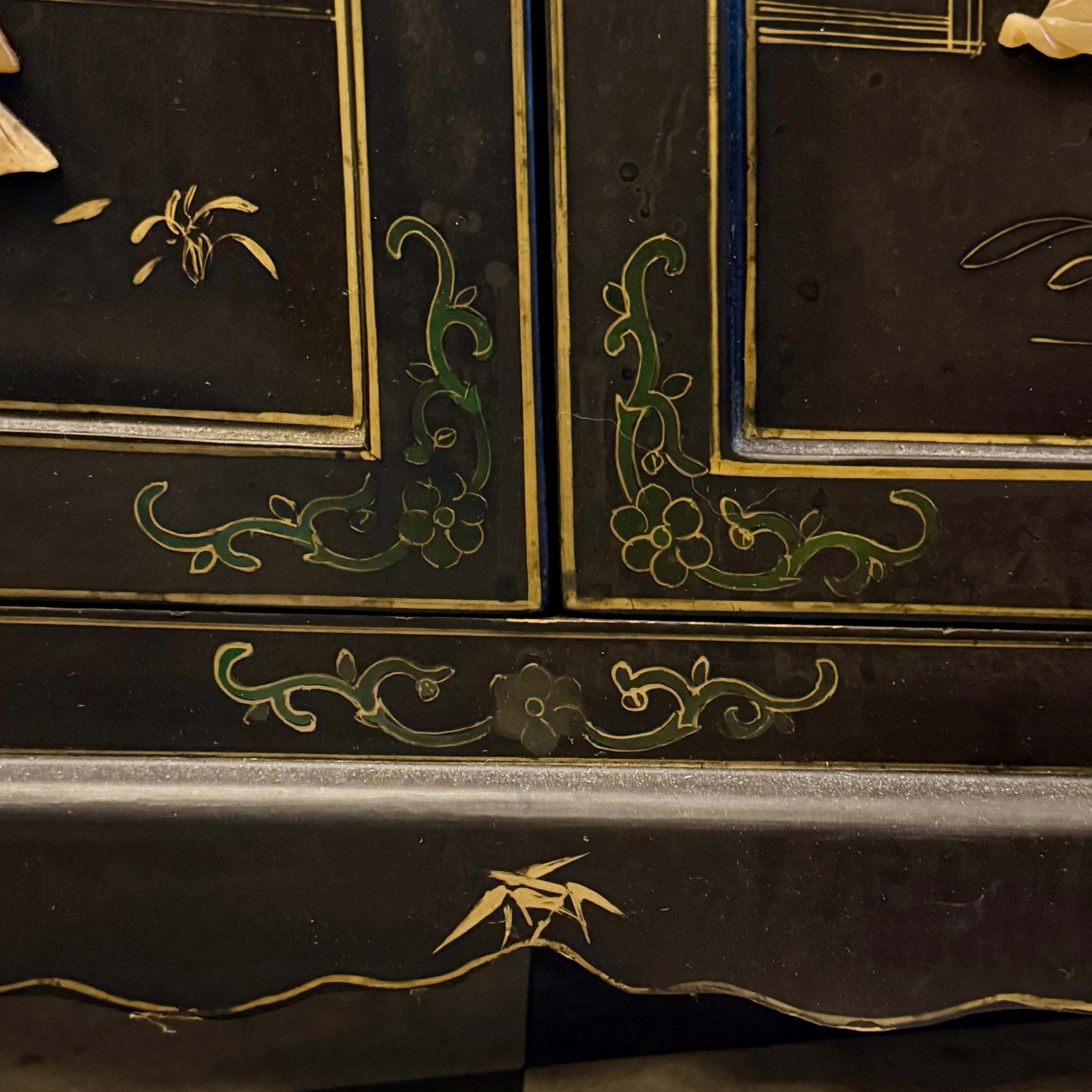 A striking Chinese lacquered cabinet with hand-painted floral scrolls, gilt accents, and carved hardstone figures set into garden scenes.
