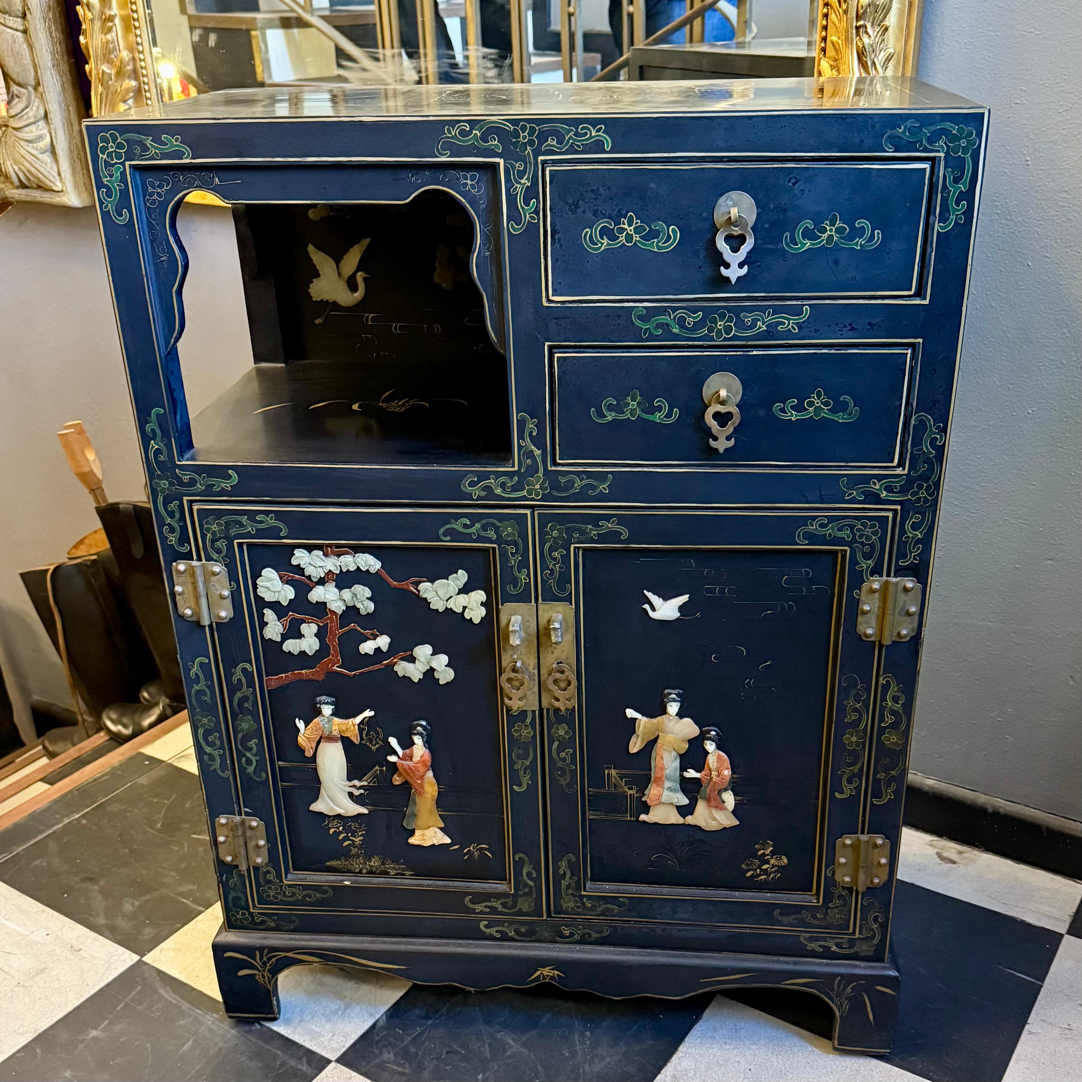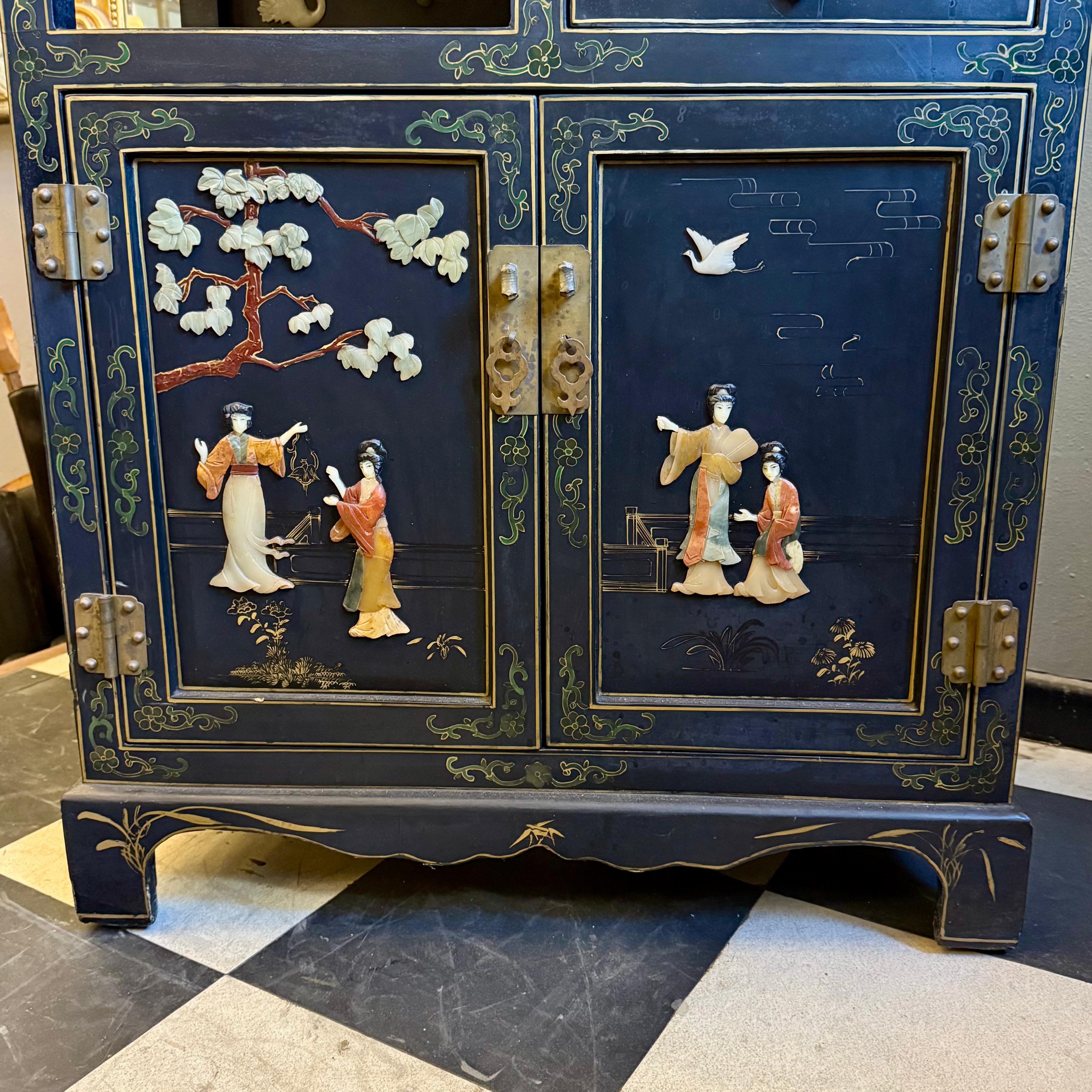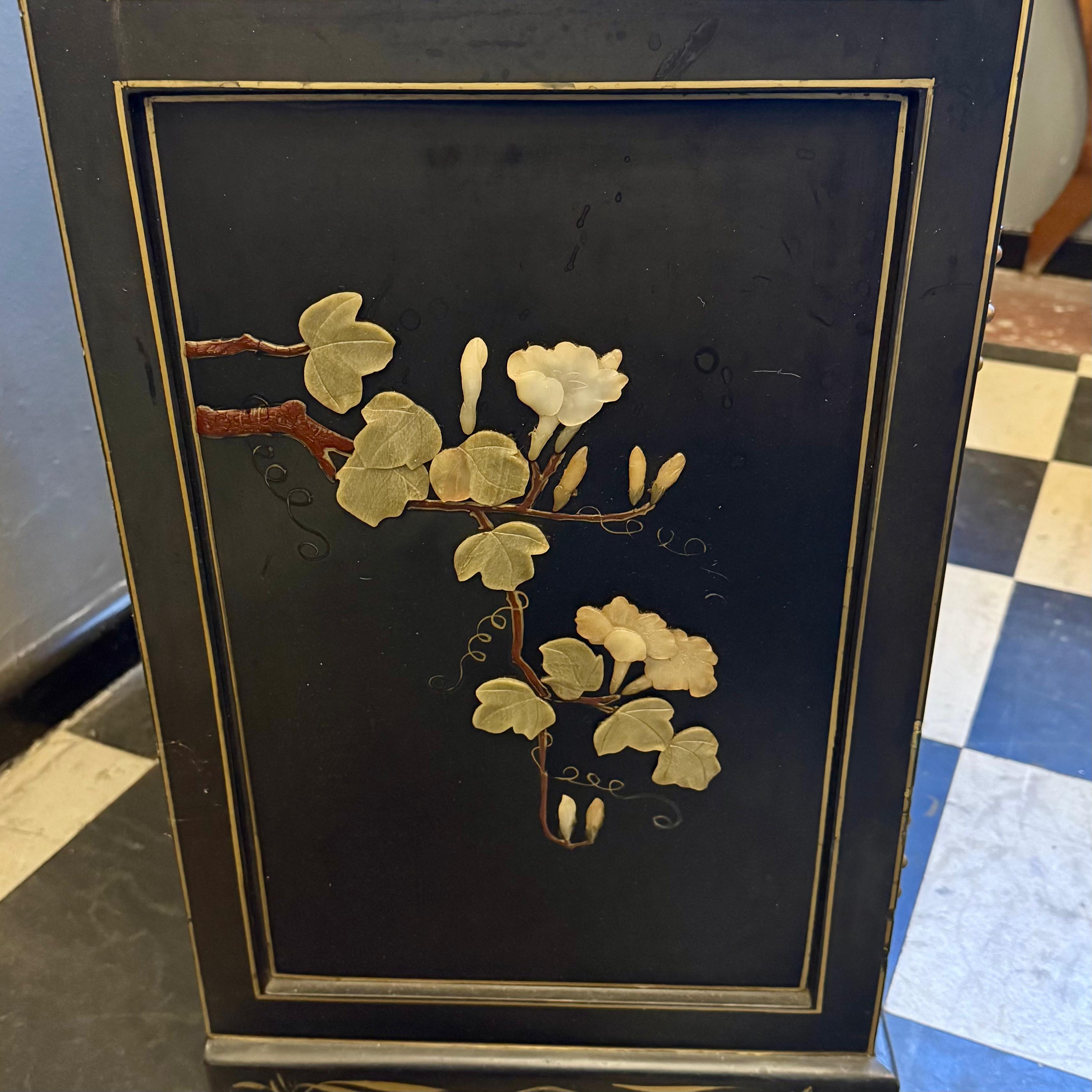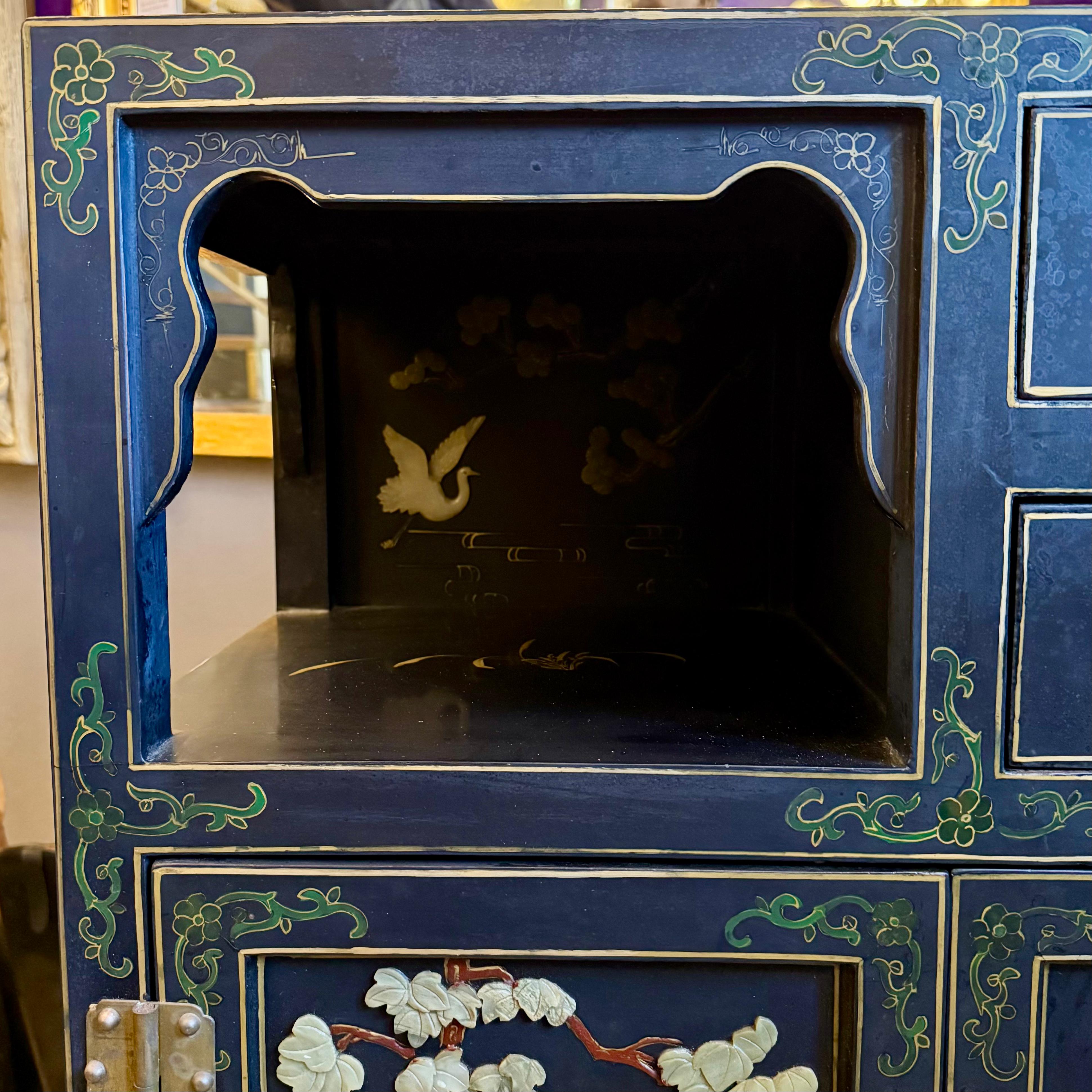 A striking Chinese lacquered cabinet with hand-painted floral scrolls, gilt accents, and carved hardstone figures set into garden scenes.