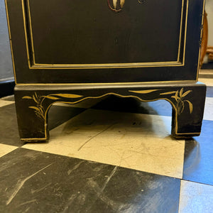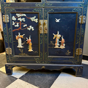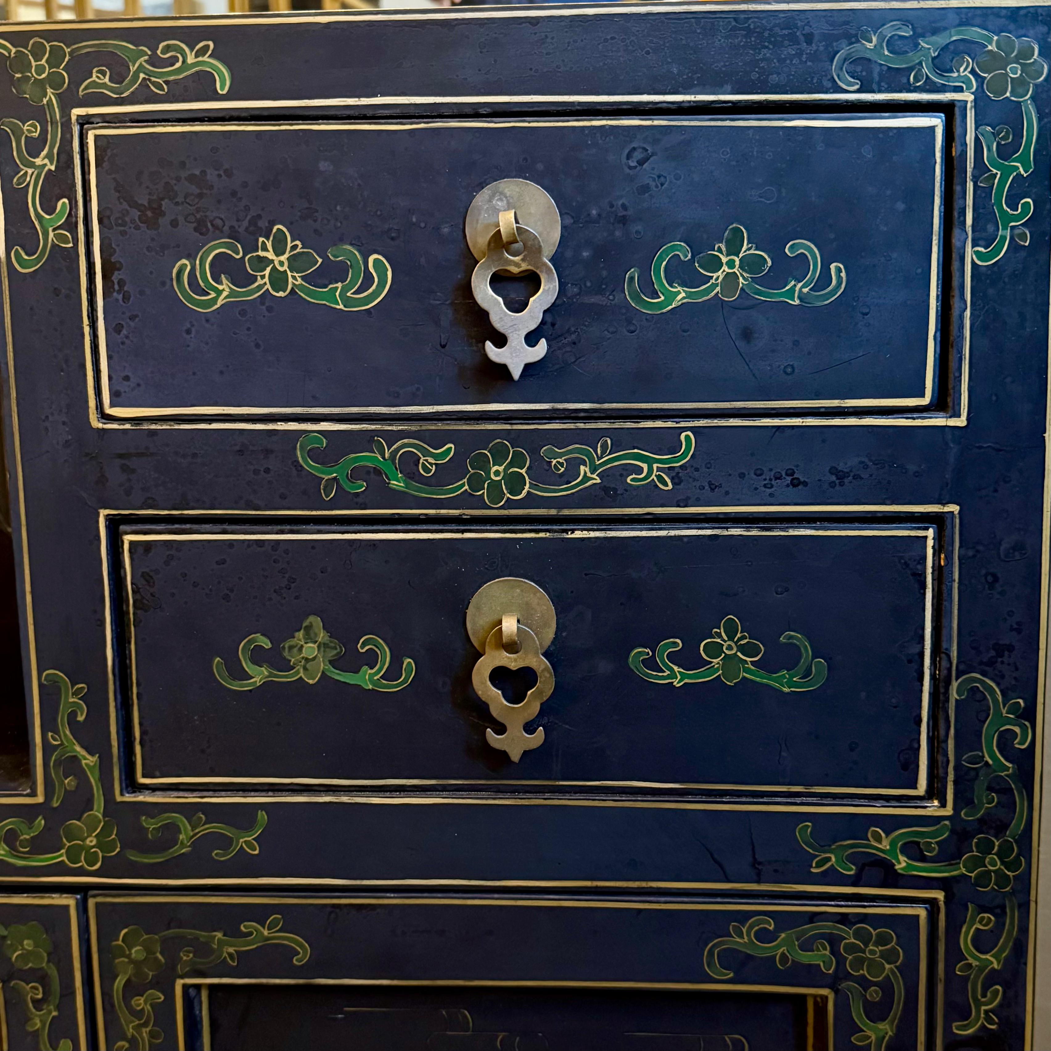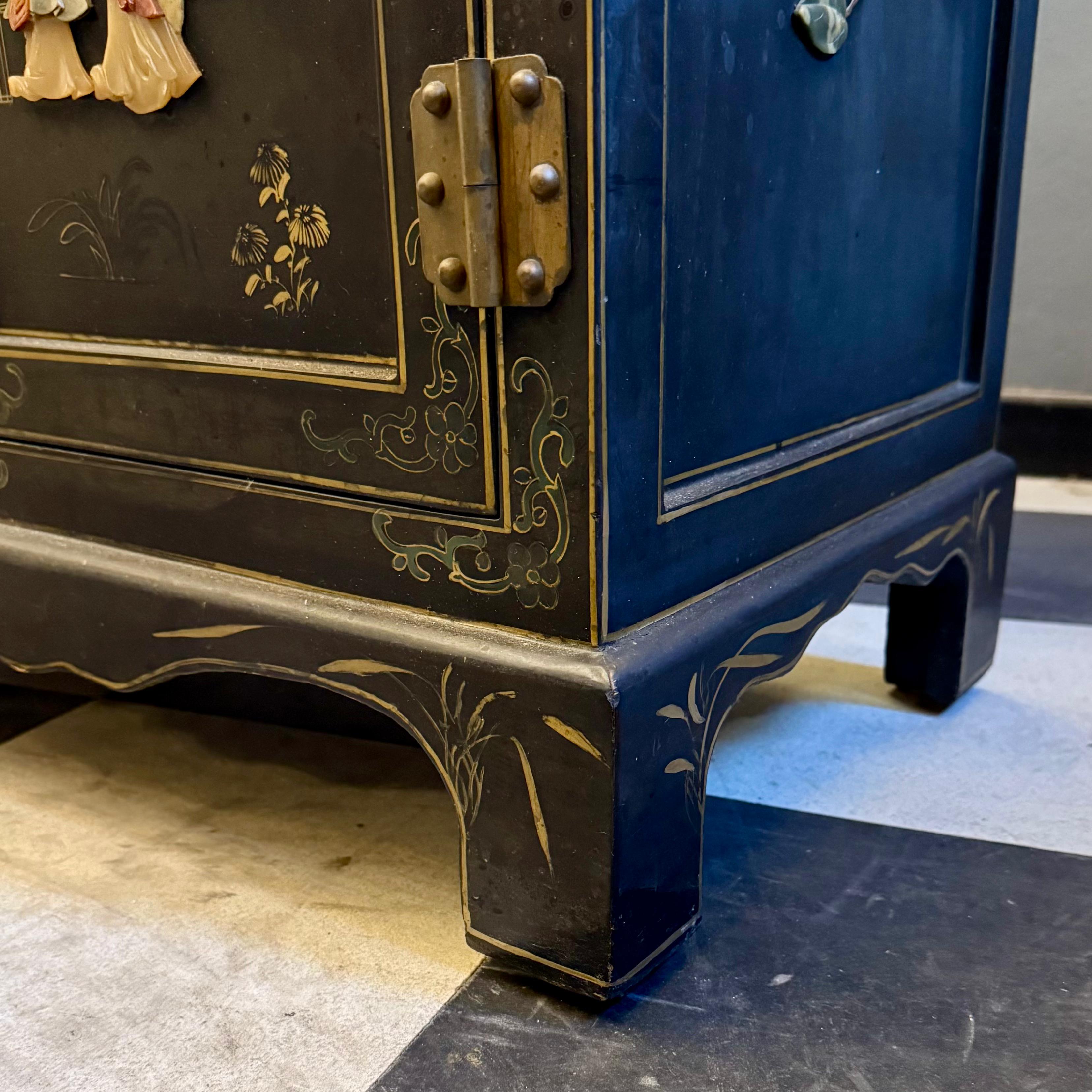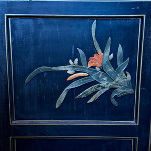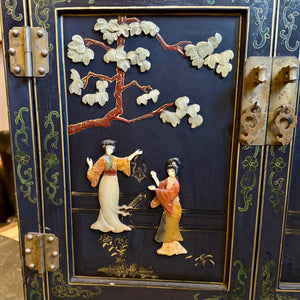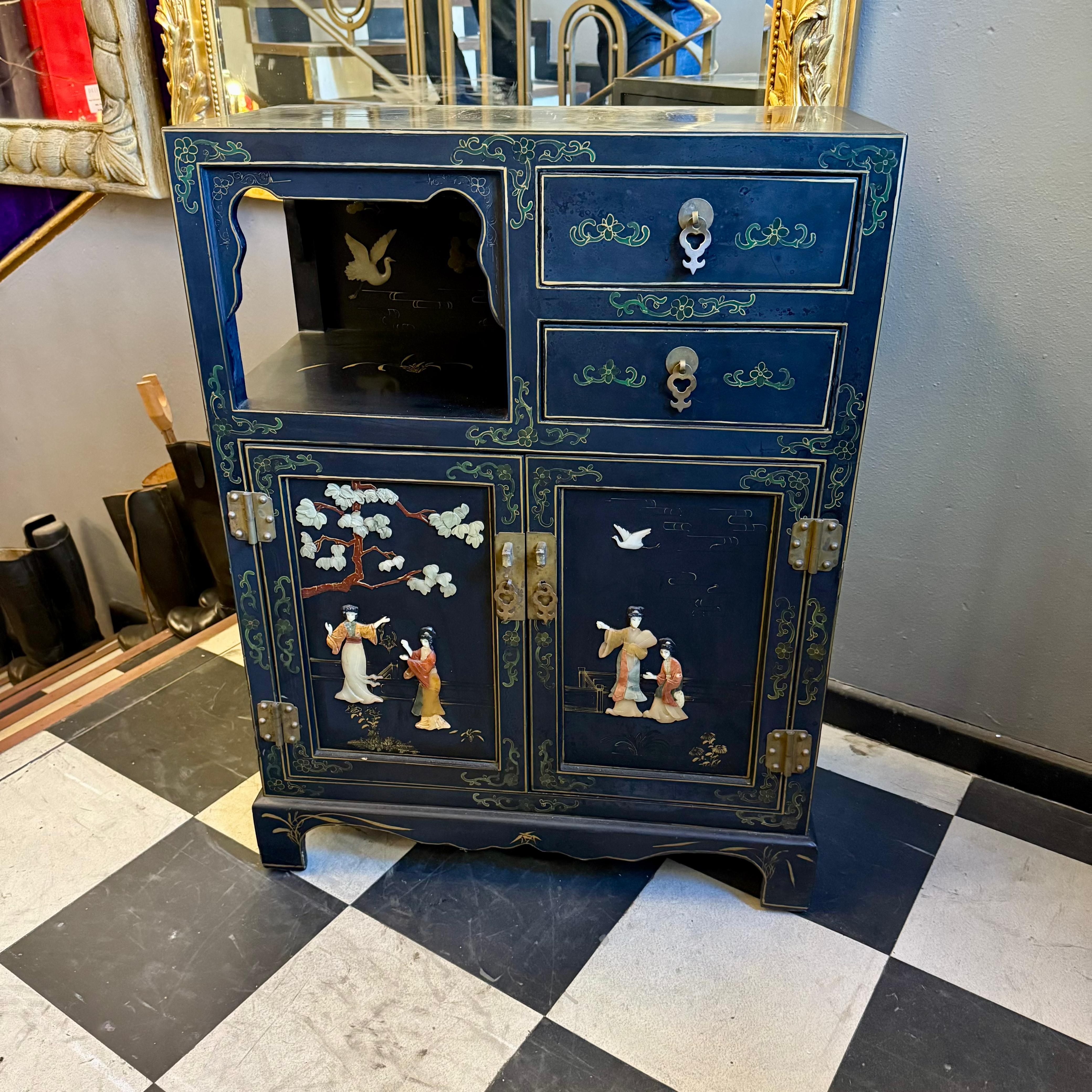 A striking Chinese lacquered cabinet with hand-painted floral scrolls, gilt accents, and carved hardstone figures set into garden scenes.