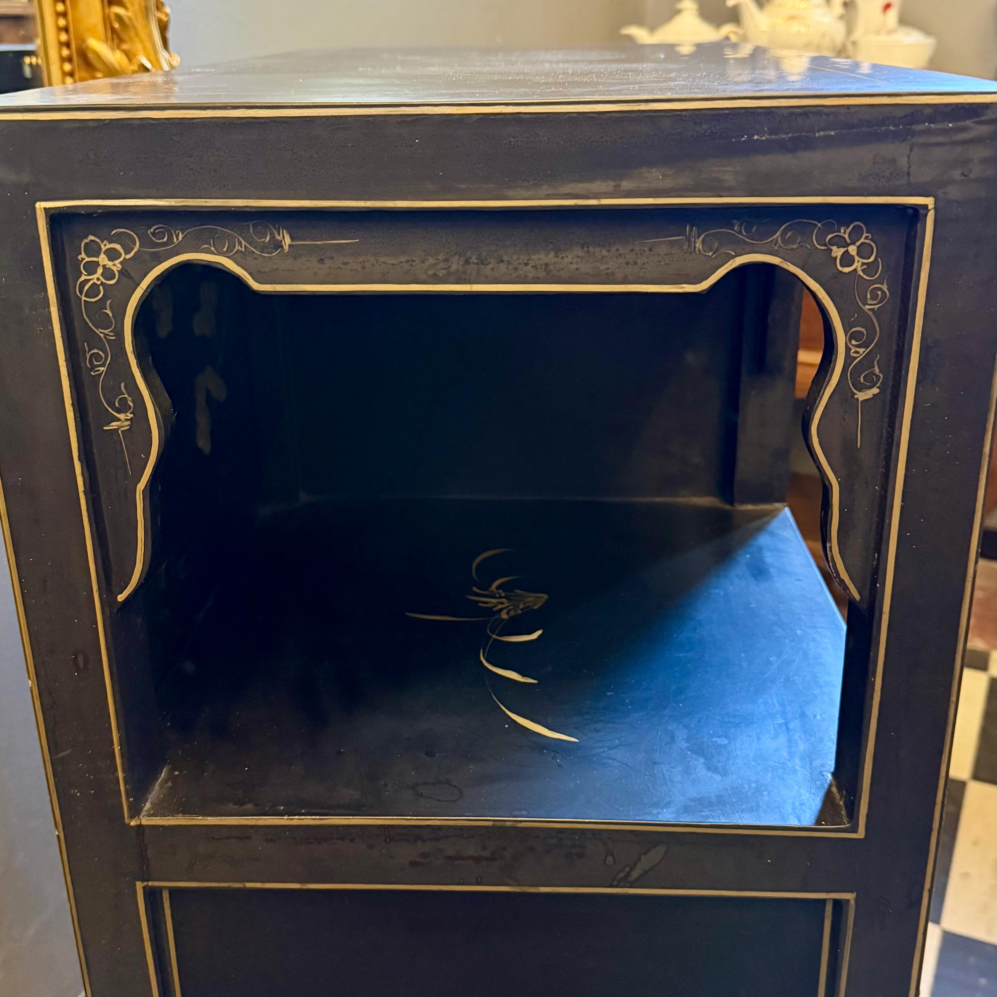 We love it as it is detailed but not too OTT! The cabinet features two small drawers, a painted display niche, and shaped brass hardware.