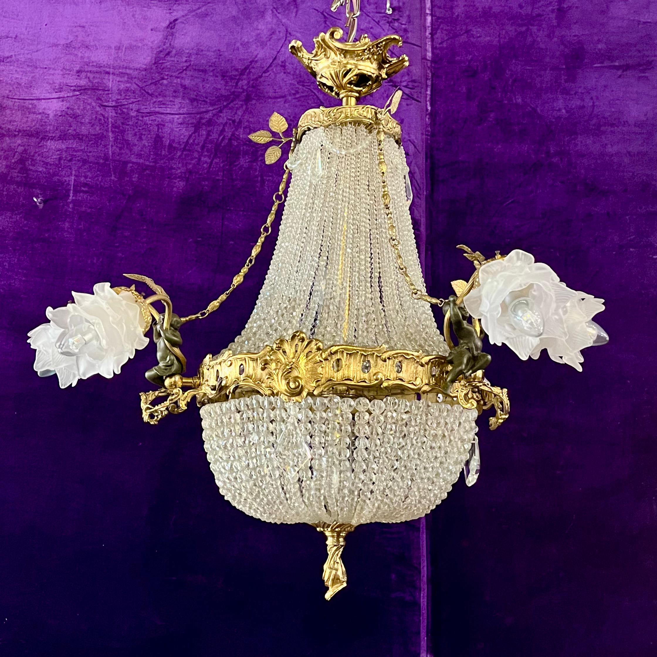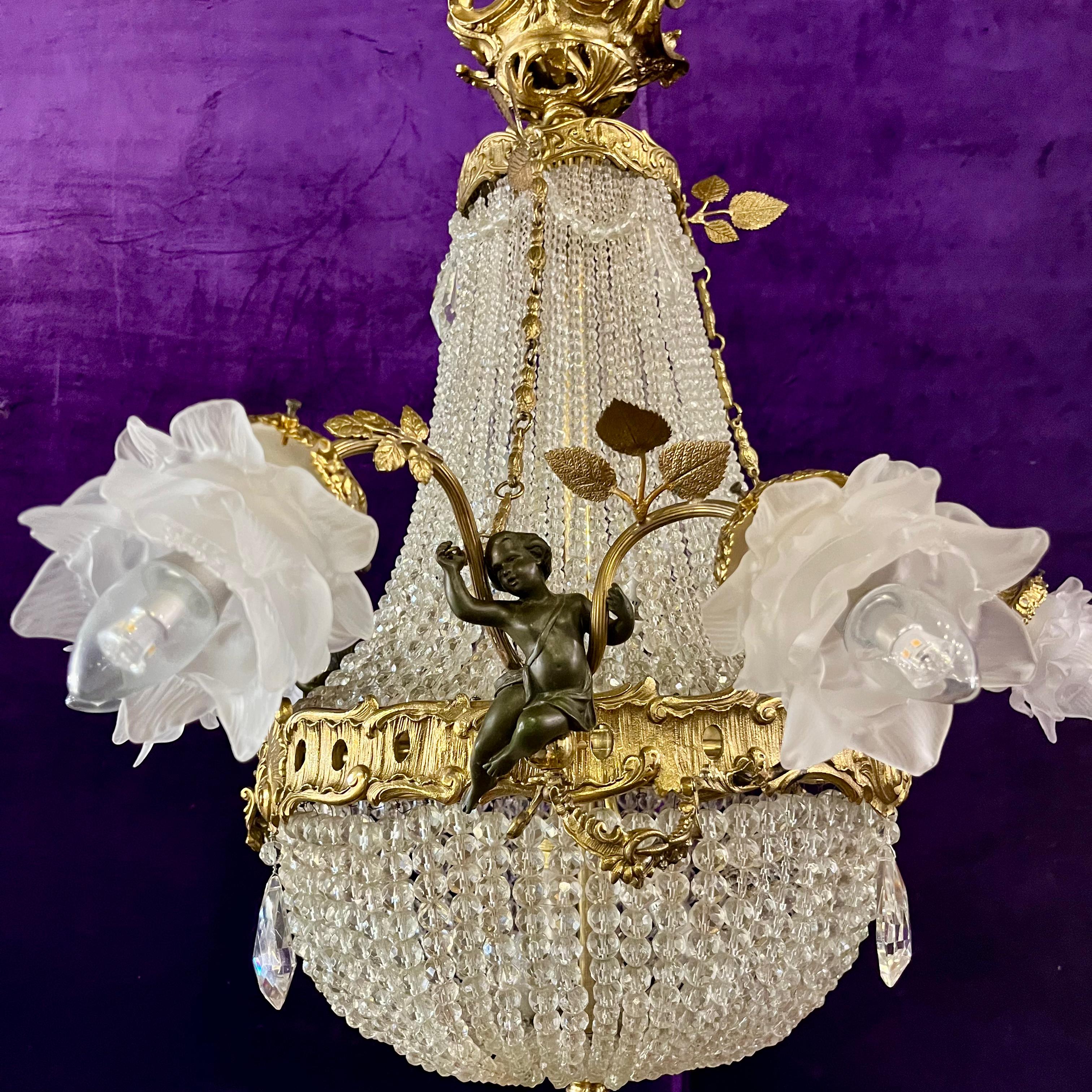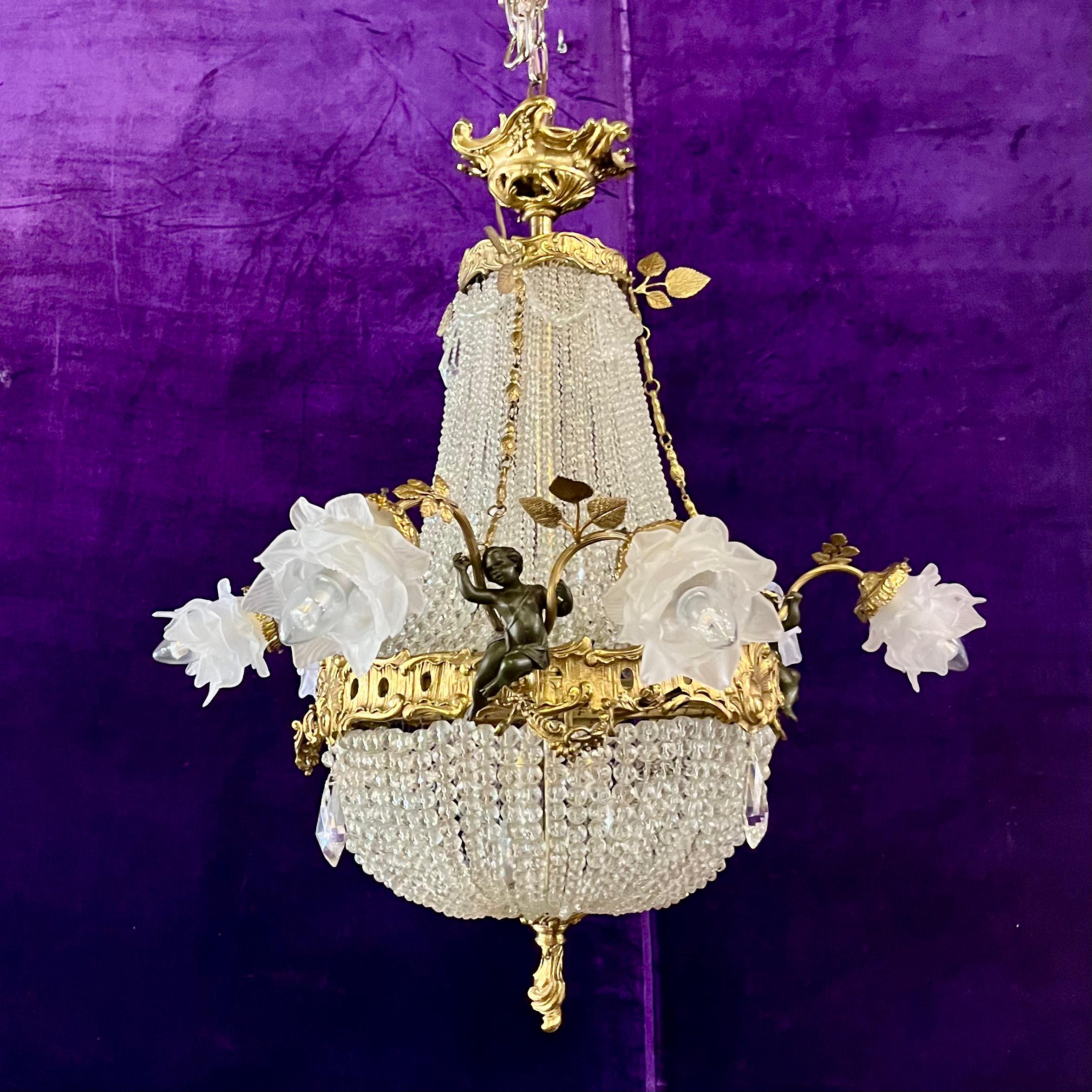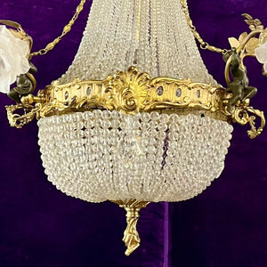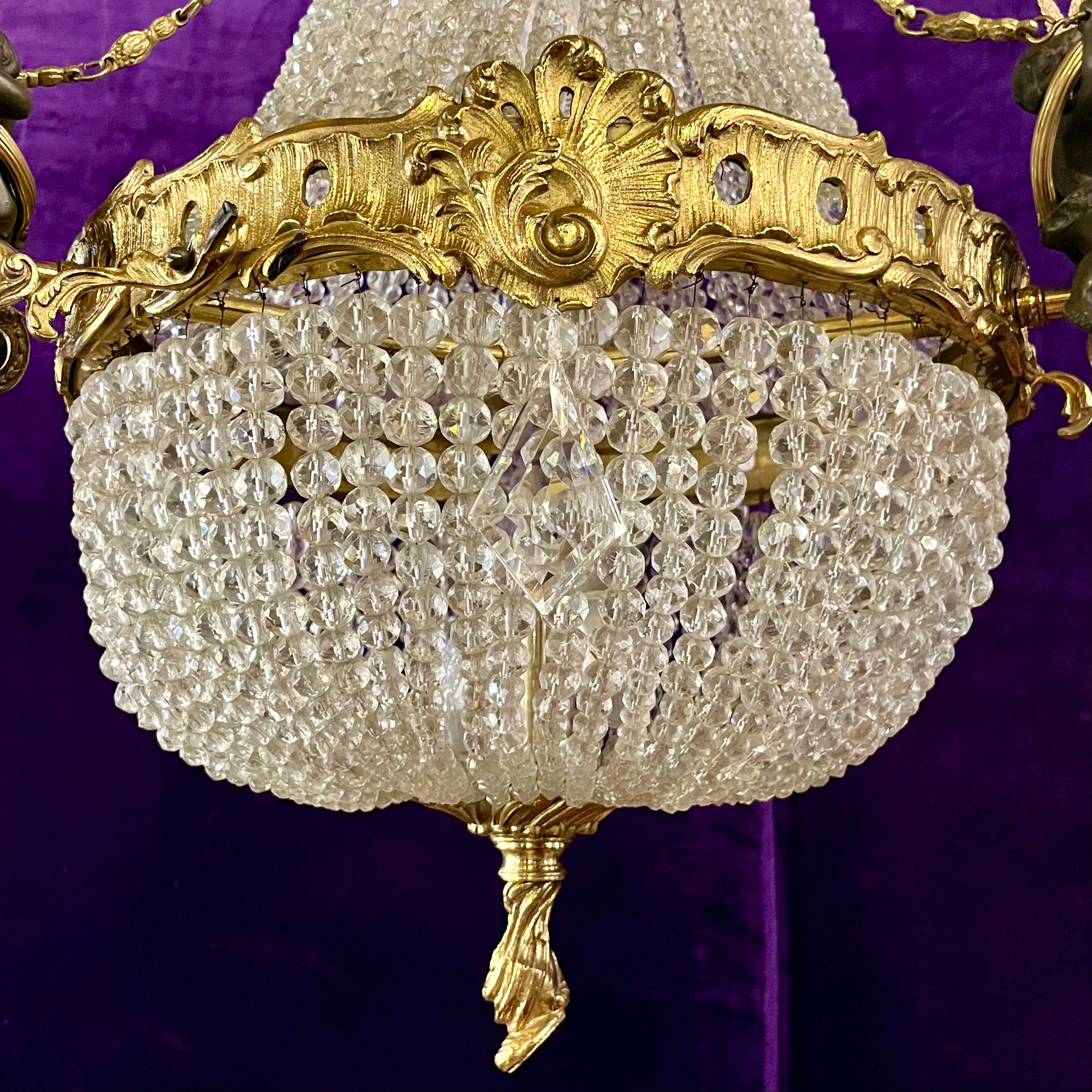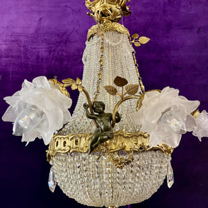 This chandelier is especially unique as it features strings of original, antique, faceted crystal beads. The inclusion of the charming cherubs makes it both opulent and playful.