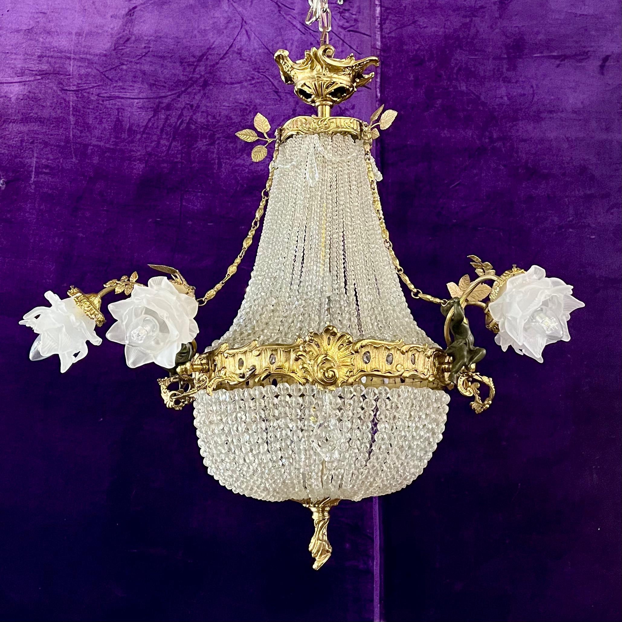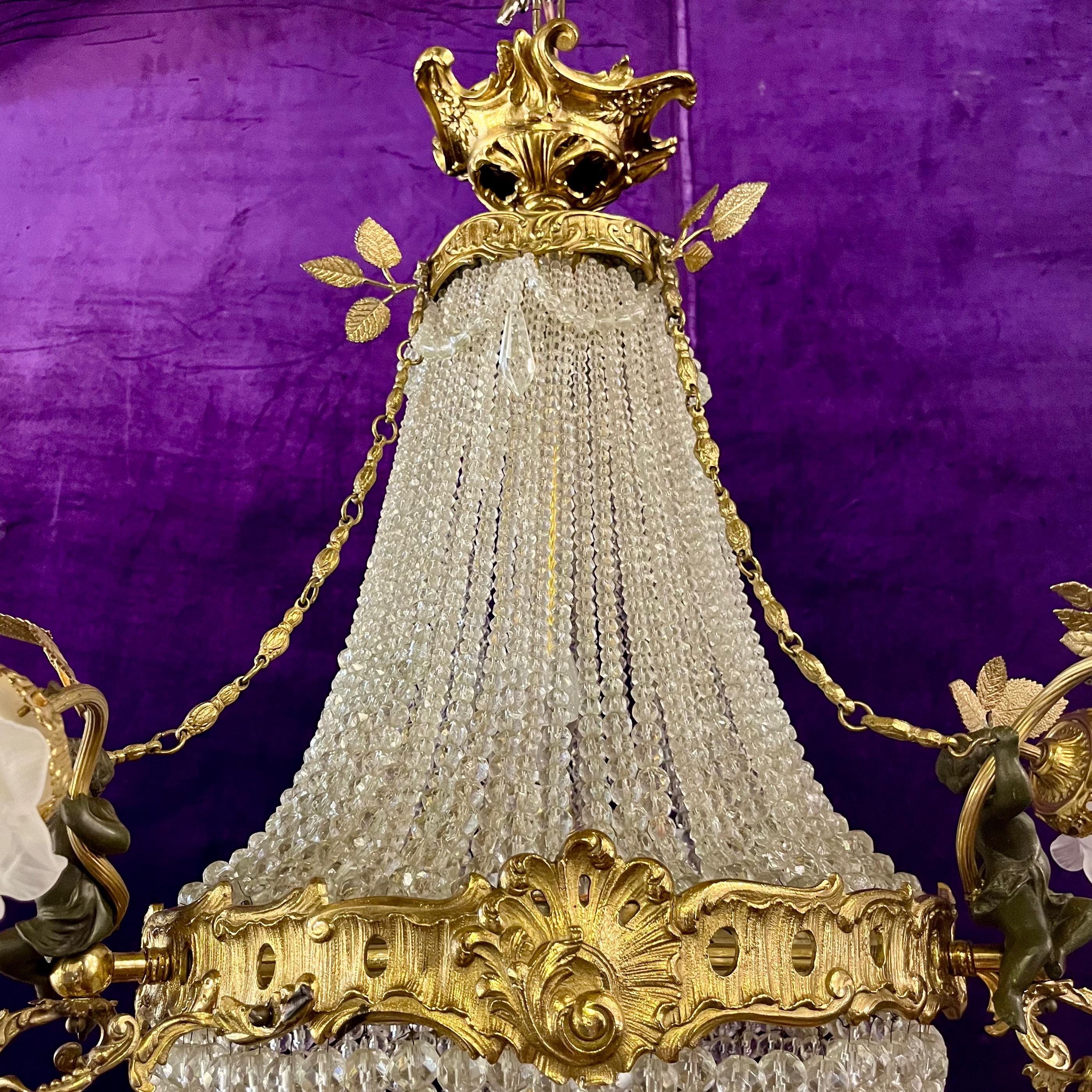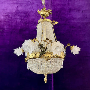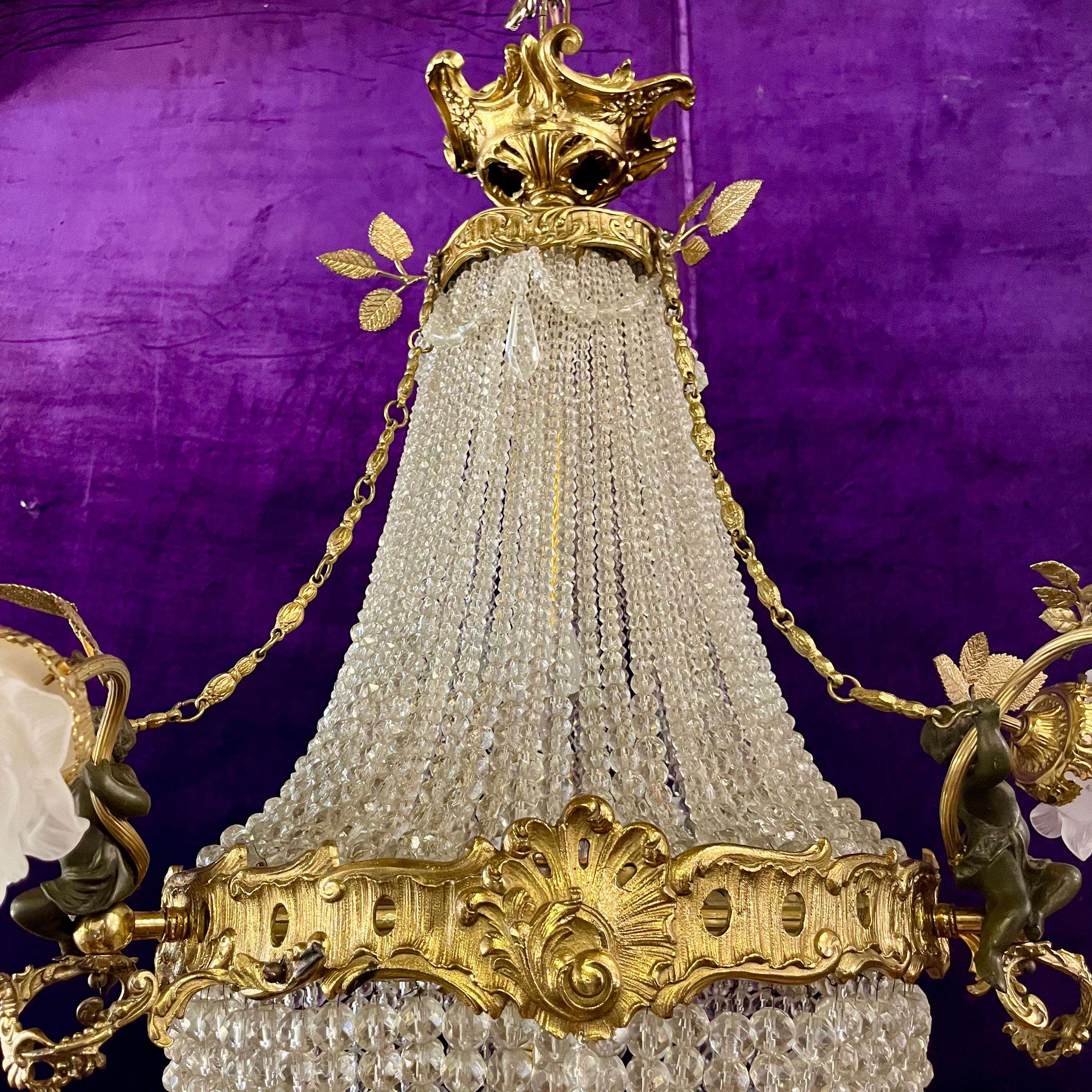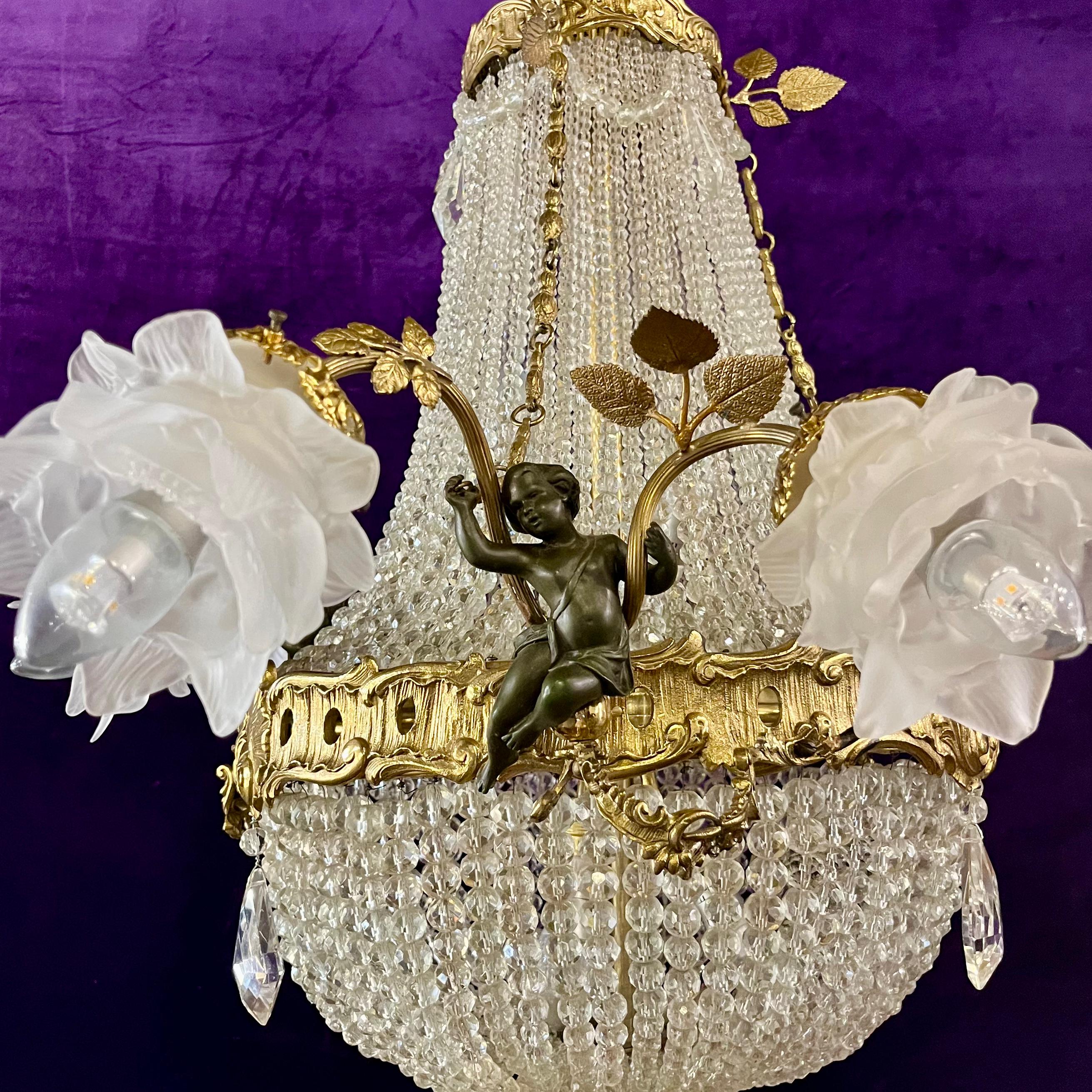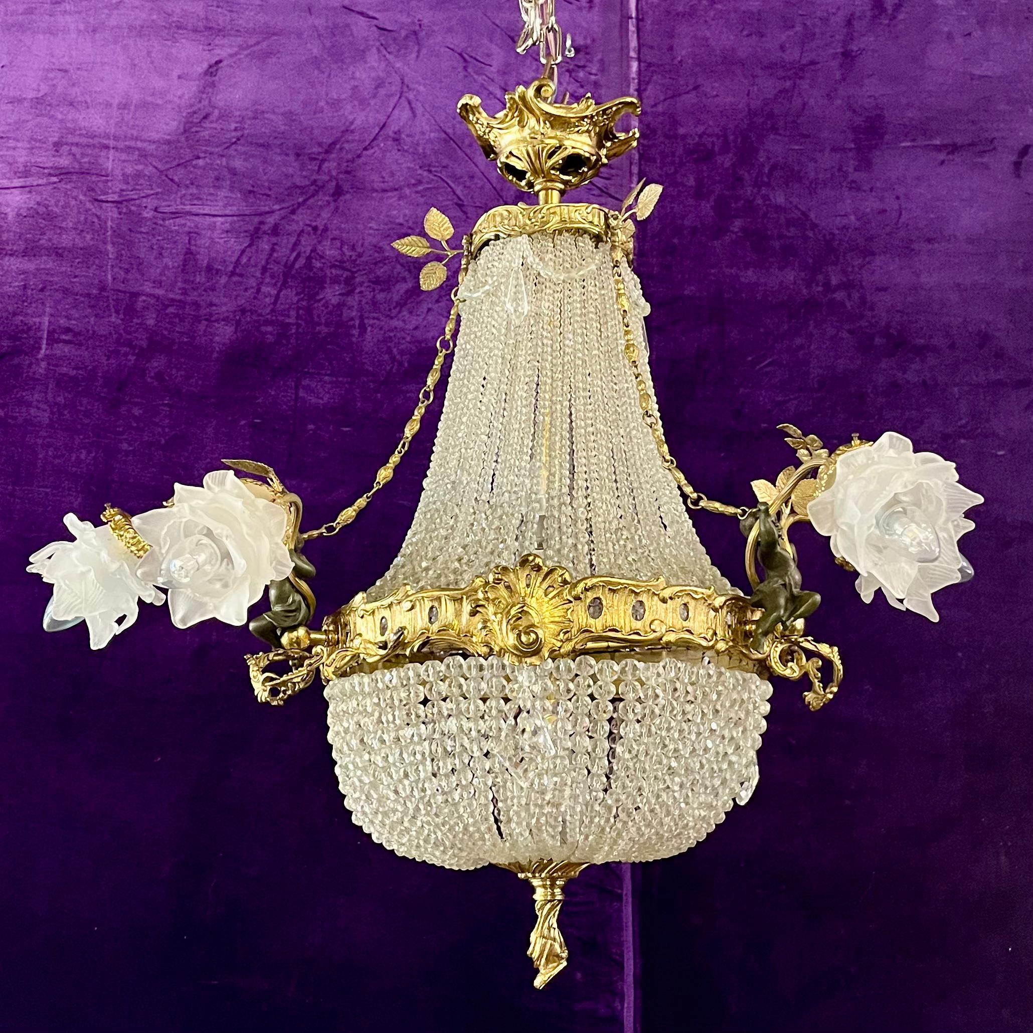 This chandelier is especially unique as it features strings of original, antique, faceted crystal beads. The inclusion of the charming cherubs makes it both opulent and playful.