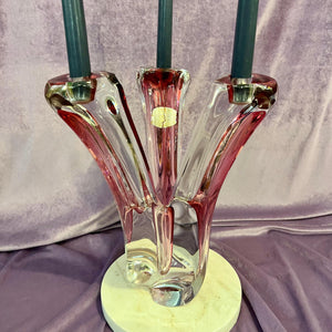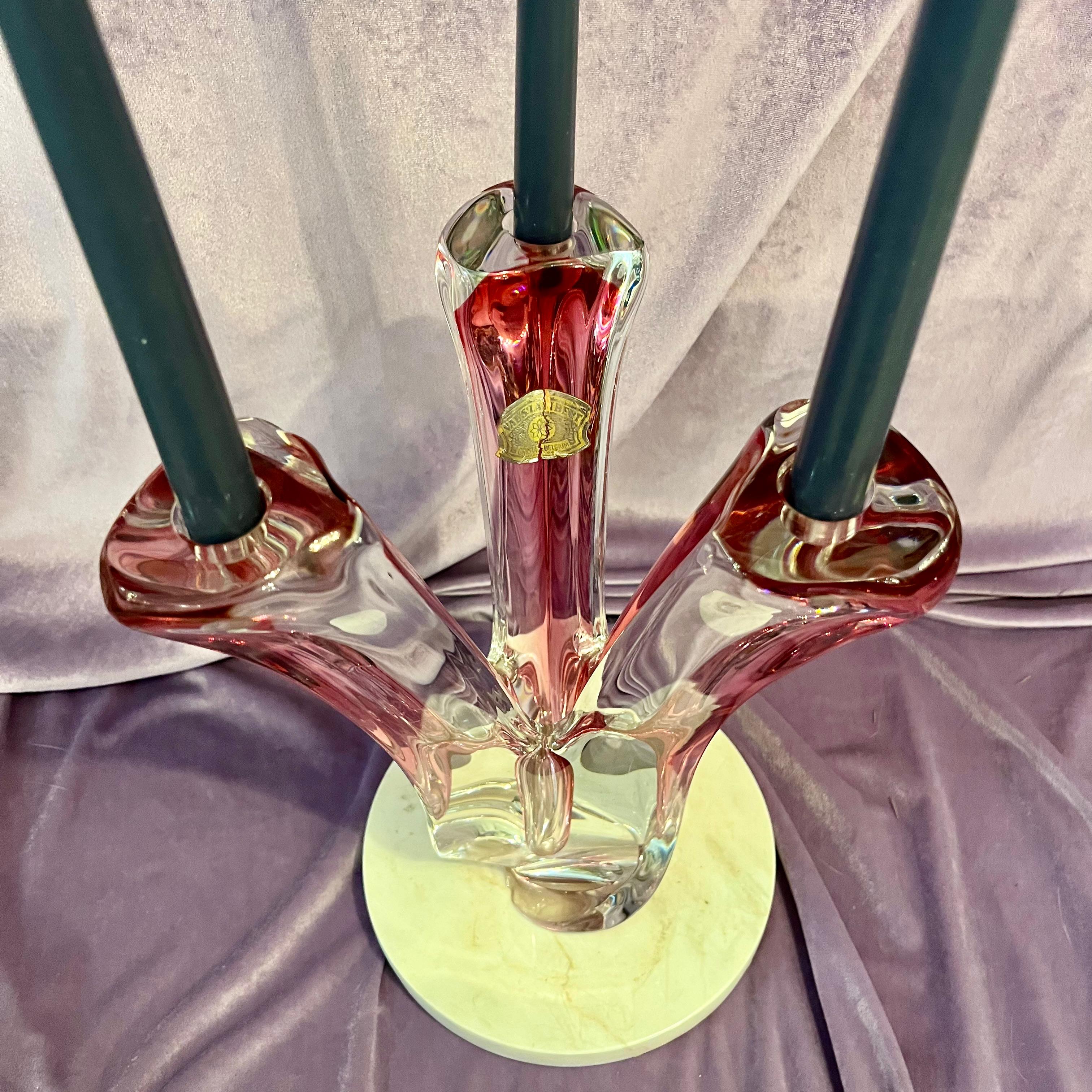A rare and sculptural red sommerso art glass candelabra by Val Saint Lambert, Belgium, circa 1960s. This three-arm design flows in a bold organic shape, with clear and ruby-toned sommerso glass flaring upward in a dramatic mid-century silhouette. The piece retains its partial gold foil Val Saint Lambert label.